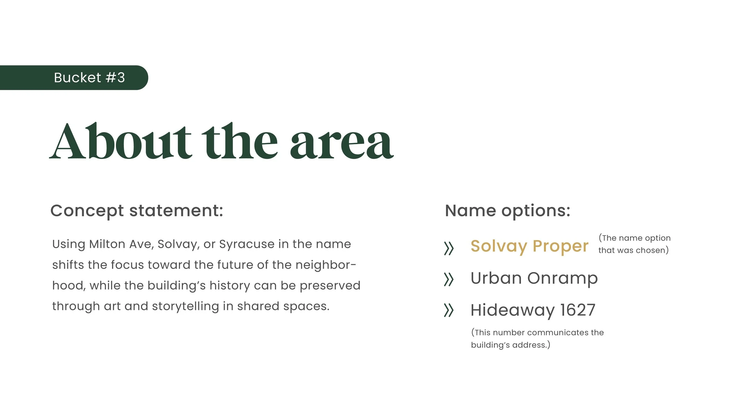 Strategy: We anchored the project in a sense of place, positioning Solvay Proper as both a nod to the village’s historic character and a marker of its ongoing resurgence. The strategy established a foundation for how the building could present itself to future tenants and the broader community.
